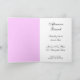 Um convite dobrado personalizado com letras de script e listras cor-de-rosa em um fundo branco. Clique em Personalizar para alterar fontes, dimensionar, adicionar ou remover texto e muito mais, até mesmo salvar seu design para mais tarde.
