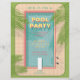 Folheto de piscina com piscina ilustrada de natação no estilo moderno do século médio. Designs incluem elementos de blues, pinks, frondes de licença de palma, piscina de natação e design.