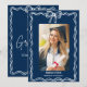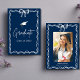 Foto de formatura moderna com letras brancas em negrito em um fundo azul marinho. O design apresenta um chapéu de formatura branco com a frase "Parabéns ao nosso Graduado". Personalize o nome, o nome da escola e o ano de formatura. Para um visual mais personalizado, altere o fundo para as cores da sua escola. O cartaz de formatura é perfeito para usar na sua festa de formatura do ensino médio ou faculdade
