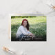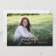 Este convite de festa de formatura moderno apresenta uma foto horizontal que preenche toda a frente do cartão e uma segunda foto desbotada no verso. A caligrafia moderna aparece sobre a foto e lê '26 diplomado'. O texto personalizado permite que você adicione o nome do formando e a escola na frente e o convite da festa no verso.