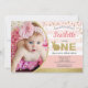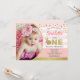 Convite de foto de festa tema coelhinha rosa e dourado para o primeiro aniversário da bebê.