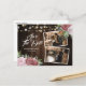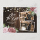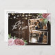 Convites de foto de data de salvamento de casamento floral rosa bege rústico elegante ideais para um casamento rústico romântico de festa cor-de-rosa. Este convite de data de salvamento apresenta um fundo de madeira de celeiro adornado com rosas cor-de-rosa, renda floral branca e luzes de corda. Itens correspondentes disponíveis.
