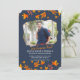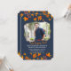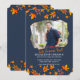 Um convite fotográfico impressionante com um fundo azul-marinho com folhas douradas e alaranjadas caindo. A janela da foto tem um formato de polígono único. (<a href="https://www.freepik.com/free-photo/content-handsome-traveler-sitting-on-flowerbed_1147786.htm">Projetado por Katemangostar</a>). (<a href='https://www.freepik.com/free-vector/stylish-autumn-sale-background-with-falling-leaves_2749447.htm'>Projetado por Starline</a>). <br/><br/>O cartão é fácil de personalizar com sua redação, fonte e cor da fonte.<br/><br/>Não é exatamente o que você está procurando? Todos os nossos produtos podem ser personalizados para atender às suas necessidades sem custo adicional.<br/><br/>Basta entrar em contato conosco em askcottonlamb@gmail.com.<br/><br/>Produtos coordenados disponíveis: Basta perguntar!