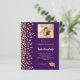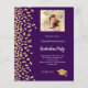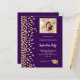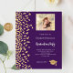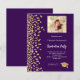Um convite de festa de formatura moderno e elegante. Um fundo roxo decorado com confetes dourados falsos. Personalize e adicione foto, nome e detalhes da festa. Texto branco.