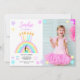 Este convite para fotos da festa de aniversário do arco-íris pastel apresenta um bolo de aniversário de glacé arco-íris com velas no topo. À direita há um grande espaço para adicionar sua foto de caneta. Este convite tem estrelas do arco-íris pastel como fronteira. Nas costas há um padrão divertido feito de balões arco-íris. Personalize o texto para se adequar à sua ocasião. Veja toda a coleção correspondente.