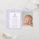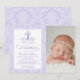 Convite de batismo de meninas em damasco roxo com cruz de pérola roxa e escrita elegante em um lindo fundo de damasco lavanda. Este convite de batismo em damasco roxo lavanda é facilmente personalizado para o seu evento, bastando adicionar os seus detalhes no estilo de letra e cor, e texto de sua escolha.