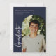 "formando" moderno com script, anúncio/convite para a graduação de fotos em arco. Recursos, tipografia branca em fundo azul marinho.