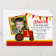 design de primeiro aniversario de trator giro com um trator vermelho com bolinhas e grande número amarelo 1. Bolinhas e borda de distribuição, faixa vermelha e amarela e quadro para sua própria foto. Texto personalizável para seu próprio toque pessoal! Perfeito para pequenos fazendeiros ou qualquer um que ama tratores. PinkInkArt original!