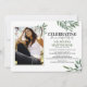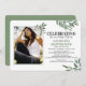 Um convite memorial extremamente simples, mas elegante, com um fundo branco clássico, uma fotografia enquadrada do seu querido, decoração de folhagem verde com aquarelas e um modelo de anúncio de funeral que é fácil de personalizar.