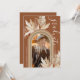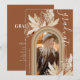 Convites de festa de formatura rústicos boêmios com fundo de terracota com um arco-íris, uma foto do graduado, folhas de palmeira secas desenhadas com aquarela, grama pampas e um modelo de texto elegante que é fácil de personalizar.