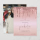 Uma alternativa de preço acessível menor que 4,5” x 5,6”. Disponível em papel cartão SEMI-BRILHANTE de 110 lb, que é a opção padrão (mais grosso para convites), OU em papel STOCK MAIS FINO de 80 lb com acabamento SEDA (ideal para inclusões). Os envelopes são opcionais e são ligeiramente maiores que o tamanho do cartão. Um design glamoroso com pingos de glitter dourado-rosado na frente, com a formatura em uma fonte elegante, e a foto do formando no verso. Personalize facilmente o restante do texto e substitua a foto de amostra no verso pela sua.