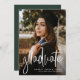 Comemore seu segundo grau ou formando universitário com este anúncio vertical de uma foto que também inclui espaço no verso para o texto do convite de festa de formatura. A escritura moderna "formando" na frente em branco é perfeita para um formando de tendência. O backer é uma cor clássica da escola vermelha com um padrão sutil, mas a cor pode ser alterada para qualquer cor da escola clicando em "personalizar".