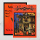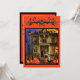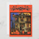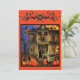 Casa assombrada com abóboras, personagens estranhos, pássaros pretos, céu em chamas e mais decoram este convite de festa de Halloween de Patricia Villa, artista.