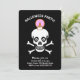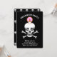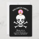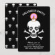 Convite de festa de Halloween com caveiras assustadoras em fundo preto. Todos os textos e números estão prontos para serem personalizados.