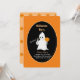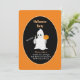 Convite de festa de Halloween moderno com fantasminha e abóbora para bebê. O texto está pronto para ser personalizado.