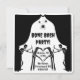 Verso: Uma cortina preta aberta adornada com três aranhas e um morcego apresenta a Festa do Esqueleto - Abaixo estão dois esqueletos assustadores focados em um par de mãos de esqueleto em forma de coração que seguram a data e hora