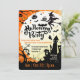Convite de Festa de Halloween Festivo; apresenta uma bruxa em uma vassoura, mansão assombrada, fantasmas, morcegos, abóboras e cores tradicionais. O convite perfeito para um evento espetacularmente assustador!
