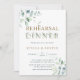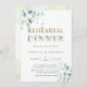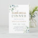 Este convite de jantar de ensaio de casamento apresenta eucalipto pintado à aquarela e folhas verdes com letras botânicas douradas.