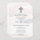 Aquarelas rosa e azul sutis se espalham pelo convite. Adornado com uma cruz estampada.