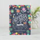 Um convite de festa de verão, com letras à mão e pontos coloridos e lampions ao redor