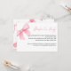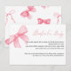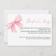 Um adorável cartão de pedido de livro para chá de bebê com arco rosa boho. Os visitantes são convidados a trazer um livro infantil novo ou usado em vez de um cartão.