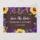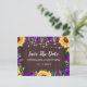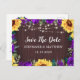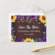 Esses cartões de convite apresentam um design rústico de girassol e rosas roxas com fundo de madeira e luzes de corda. Personalize-os com seu texto na frente e atrás. Papelaria de casamento correspondente também disponível.