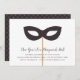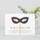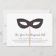 Convites elegantes de mascarada para a véspera de Ano Novo ou qualquer ocasião de festa apresentam uma máscara de olho em um pau, tocando os detalhes de sua festa em um roteiro de caligrafia profunda e preto e em letra de bloco.