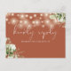Um convite de música elegante com folhagens florais, luzes de corda e tipografia sofisticada em um fundo de terracota. O verso apresenta seus detalhes e um divertido pedido de música para os convidados. Criado por Thisisnotme