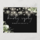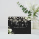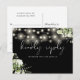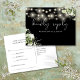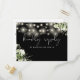 Um cartão de resposta a pedido de música elegante, apresentando folhagens florais, luzes de corda e tipografia sofisticada em um fundo preto e branco. O verso apresenta seus detalhes e um pedido de música divertido para os convidados. Criado por Thisisnotme©