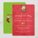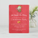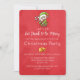 Um convite de festa de Natal festivo com um elfo fofo segurando uma bengala de Natal listrada de vermelho e branco. O texto é separado por um par de sinos dourados. Definido em um fundo vermelho natalino brilhante.