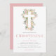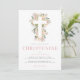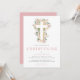 Um convite elegante para você com uma garotinha com flores rosa bonito e folhas verdes atrás de uma cruz branca. Personalize com seus detalhes em rosa e cinzas.