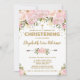 Convite para batizar, de cor rosa e ouro, feminina, com flores cor-de-água cor rosa e pinceladas, e borrifar com esférulas douradas