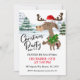 Um alce vestindo um chapéu de Papai Noel e dando presentes está representado neste lindo convite de festas de Natal.