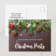 Cartão postal de convite de Natal com uma fotografia rústica de uma mesa de madeira marrom com pinhas, agulhas de pinheiro, neve e enfeites de Natal. Festivo e encantador.