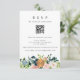 Convite de RSVP para casamento moderno rústico boêmio ou outro evento com código QR para digitalização no site e um script de tipografia manuscrita editável e sofisticado, apresentando uma borda de buquês de flores pastéis boêmias rosa, azul-marinho e creme marfim com folhagem verde-sage e um círculo monogramado falso metálico dourado e cobre. +++++++ Fácil de personalizar com seus detalhes! Adequado para casamentos rústicos elegantes ao ar livre no jardim, chá de bebê, festa de aniversário, noivado, chá de noiva ou outras celebrações e recepções.