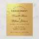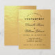 Um convite de noivado econômico que tem apenas texto preto em folha de ouro falso. Os nomes são escritos em uma fonte caligráfica elegante, o resto em maiúsculas. A primeira linha é um texto arqueado.