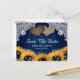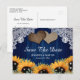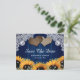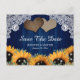 Convites de noivado de casamento rústicos com girassóis azul marinho e girassóis com eucalipto e flores de respiro de bebê em um fundo de madeira rústica adornado com luzes de corda e dois corações de aniagem. Cartão ideal para um casamento rústico no campo ou celeiro inspirado em girassóis. Itens correspondentes disponíveis.