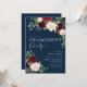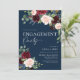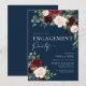 Convite de festa de noivado floral Boho Navy Burgundy e Blush. Este convite é caracterizado por rosas e flores boho burgundy e blush com duas fontes modernas e sofisticadas que moldam as tendências dos eventos festivos presentes e futuros.