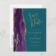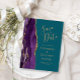 Este convite de noivado moderno e elegante apresenta uma borda de ágata em aquarela roxa com brilho dourado falso. O texto personalizável é dourado sobre um fundo turquesa. O verso repete as informações, junto com um endereço de retorno personalizável.