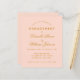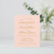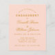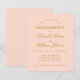 Um convite de festa de noivado simples com uma cor moderna: rosa corado. Tem apenas texto dourado sobre fundo rosa corado. Os nomes são escritos em uma fonte caligráfica elegante, o resto em maiúsculas. A primeira linha é um texto arqueado.