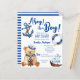 Convite de orçamento de chá de bebê náutico do ursinho marinho ahoy é um menino com um pequeno ursinho marinheiro em um boné de marinheiro azul marinho, âncora, anel de salvamento, para um convite de chá de bebê temático marinho náutico para um menino.