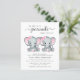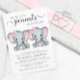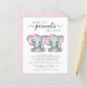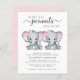 Um convite para chá, bonito e econômico, para meninas virtuais gêmeas com "Dois Pequenos Amendoins Doce Estão A Caminho" escrito numa mistura de tipografia moderna de cinza mole e roteiro de na moda, e duas aquarelas cor-de-rosa pastel de elefantes bebês. Personalize o nome da futura mãe e os detalhes do chá virtual em uma simples tipografia de cinza.