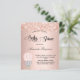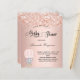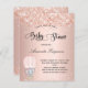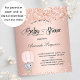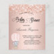 Para um chá de bebê, celebrando uma menina. Um fundo falso metálico rosa dourado. Decorado com pó de brilho falso e um pequeno elefante bebê menina em um balão de ar quente. Personalize e adicione o nome da futura mamãe e detalhes da festa. O nome e o texto: Chá de Bebê são escritos com um estilo de letra manuscrita