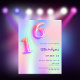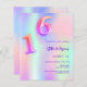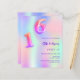 Um convite de festa Sweet 16 feminino e delicado. Um fundo colorido holográfico em roxo, rosa, verde menta, dourado rosado. Personalize e adicione um nome e detalhes da festa. O nome é escrito com um estilo de letra manuscrita, letras roxas. O número 16 é escrito com uma fonte estilo balão, manuscrita.