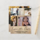 Elegante anúncio de salvar nossa data. Este modelo em dourado rosado apresenta espaço para 4 fotos de casais favoritos em branco com caligrafia manuscrita legal em cinza escuro. Fácil de editar com seus próprios detalhes exclusivos.