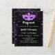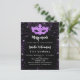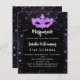 Para uma Mascarada elegante, 21ruas (ou qualquer idade) festa de aniversário. Um clássico fundo negro. Decorado com faxes roxos e uma máscara de mascarada. Personalize e adicione um nome, idade e detalhes da festa. O nome é escrito com um script de estilo manuscrito
