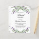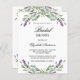Um fundo branco. Decorado com flores de lavanda violeta e verde de eucalipto. Personalize e adicione um nome e detalhes da parte. O nome é escrito com um script de estilo manuscrito. 1 folha de papel = 1 convite impresso borda a borda.
