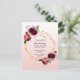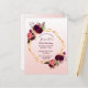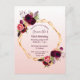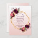 Na frente: um convite para uma festa de aniversário de 50ª (ou qualquer idade). Um rosa dourado elegante e tenente, fundo de gradiente branco com uma falso estrutura geométrica dourada. Decorados com flores roxas escuras e burgueiras, rosas e penas do estilo "boho". Modelos para um nome e detalhes da festa. O nome é escrito com um script de estilo manuscrito, letras cor roxa. Traseira: rosa dourado, fundo de gradiente branco. Dica: Se você não quiser que pareça um cartão postal, clique em personalizar, vá para o verso e remova o divisor e o carimbo de posto.