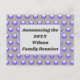 Anuncie sua reunião familiar com esses cartões postais vibrantes e baratos. O padrão na frente apresenta um padrão de bolinhas azul vívido contra um fundo de cinza escuro. O centro apresenta um retângulo de cinza azul para fornecer o plano de fundo do seu anúncio, nome da família e ano. A parte de trás do cartão postal oferece bastante espaço para os detalhes do seu evento.