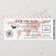 Convite de passagem aérea de casamento com data de salvamento com um mapa mundial de destino de folha de rose gold elegante, bússola, avião e um modelo de texto personalizado.